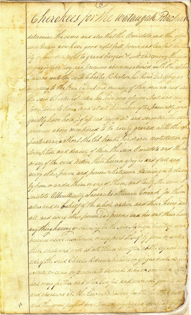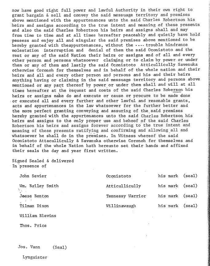 Below is a digital copy of the Wataugah Purchase indenture (deed) made from Washington County Deed Book A (sometimes referred to as the “Watauga Purchase book”) in the Washington County Archives, along with a transcription of the same made by Mary Hardin McCown. (Click on the individual images to enlarge and double click to zoom in.)