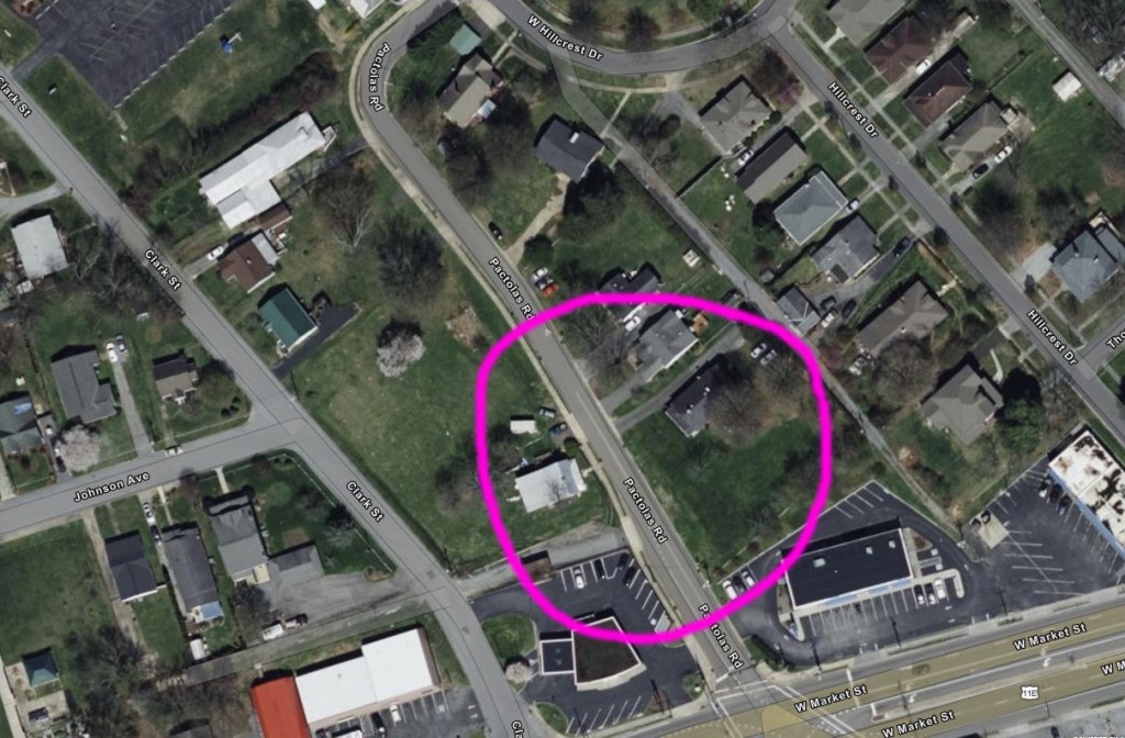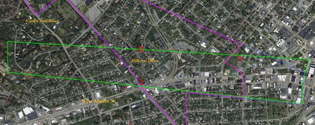This property (green boundary) is in present-day downtown Johnson City and was just north of the property owned by the sons of Robert Young. The small red number 1 near the intersection of the green and purple boundaries of the bottom edge of the plat indicates a small variation in the deed calls of the William Nelson plat, which is the reason we focused on this property. The deed indicates that there were graves in this area located near present-day Pactolas Road, but there is now no trace of them. These graves were mentioned in early deeds beginning in 1794, but are not noted in any deed after 1821.