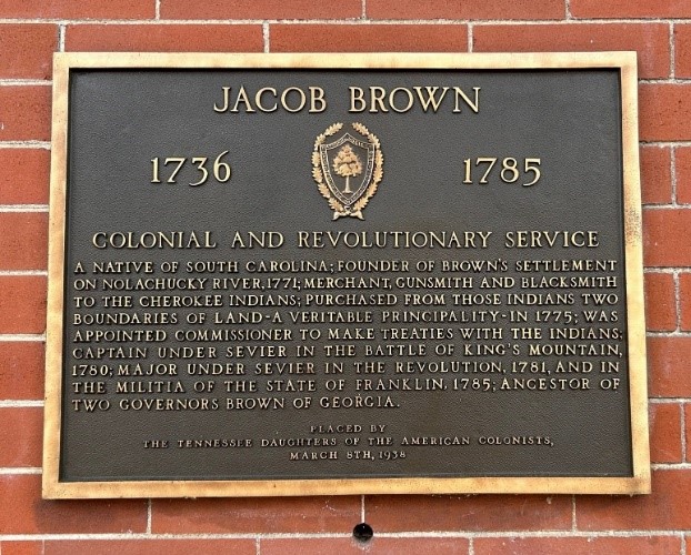 A native of South Carolina; founder of Brown’s Settlement on Nolachucky River, 1771; merchant, gunsmith and blacksmith to the Cherokee Indians; purchased from those Indians two boundaries of land–a vertitable principality–in1775; was appointed commissioner to make treaties with the Indians; Captain under Sevier in the Battle of King’s Mountain, 1780; Major under Sevier in the Revolution, 1781, and in the Militia of the State of Franklin, 1785; Ancestor of two Governors Brown of Georgia. Placed by the Tennessee Daughters of the American Colonists,