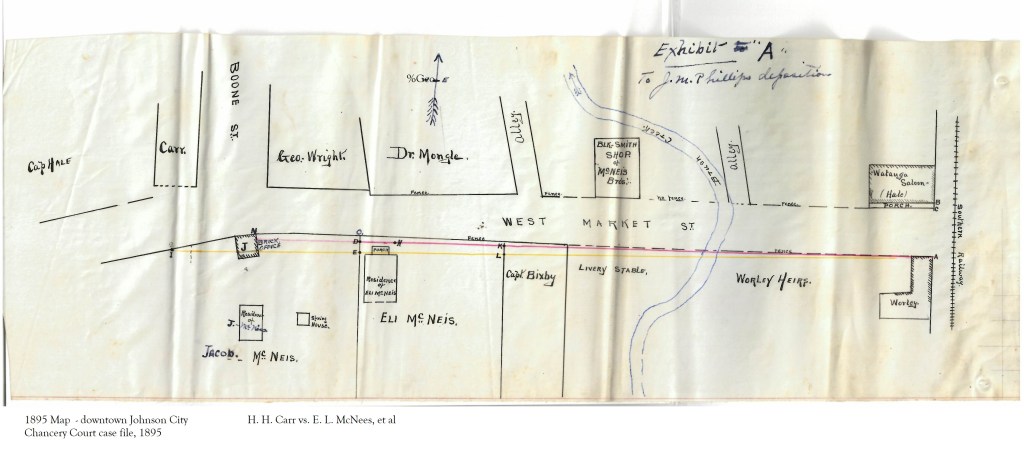 The two maps below depict the area of Boone Street and West Market Street in Johnson City. The hand-drawn map was evidence in the Chancery Court case file, Carr vs. McNees, 1895. Included is a modern-day map of the area. Notice the Watauga Saloon, a livery stable and blacksmith shop.