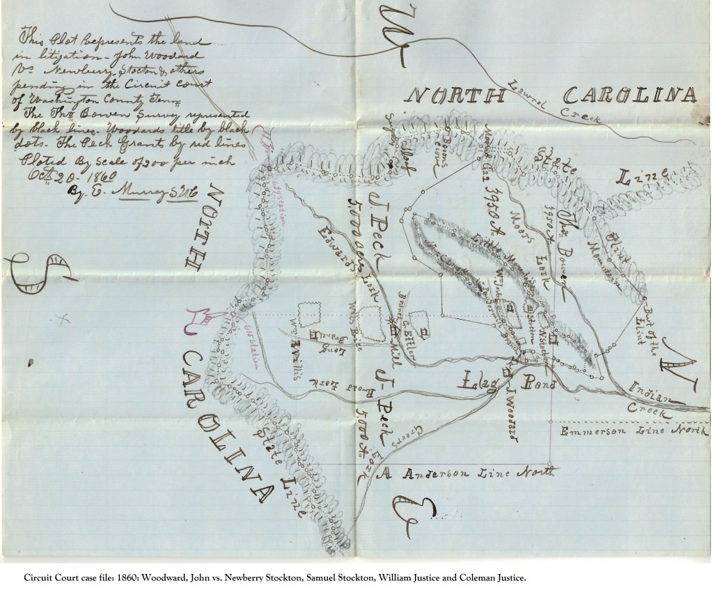 This map shows the Flag Pond area, now located in Unicoi County. Shown are the names, Peck, Edwards, Bowen, Anderson, Emerson, Ettler, Woodard and Stockton and “Jestes.” This map was in the Circuit Court case file: 1860: Woodward vs. Stockton and Justice.