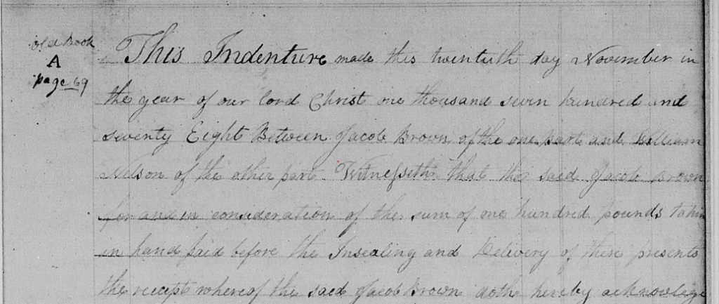 This is a scan of the original survey of the property. When compared to the image below, you will notice that the drawing is “upside down.” This is because the surveyor used the available paper and sketched the image to fit within the bounds. Nelson made entry on 03 Apr 1780. The deed was not registered until 1792…12 years later!